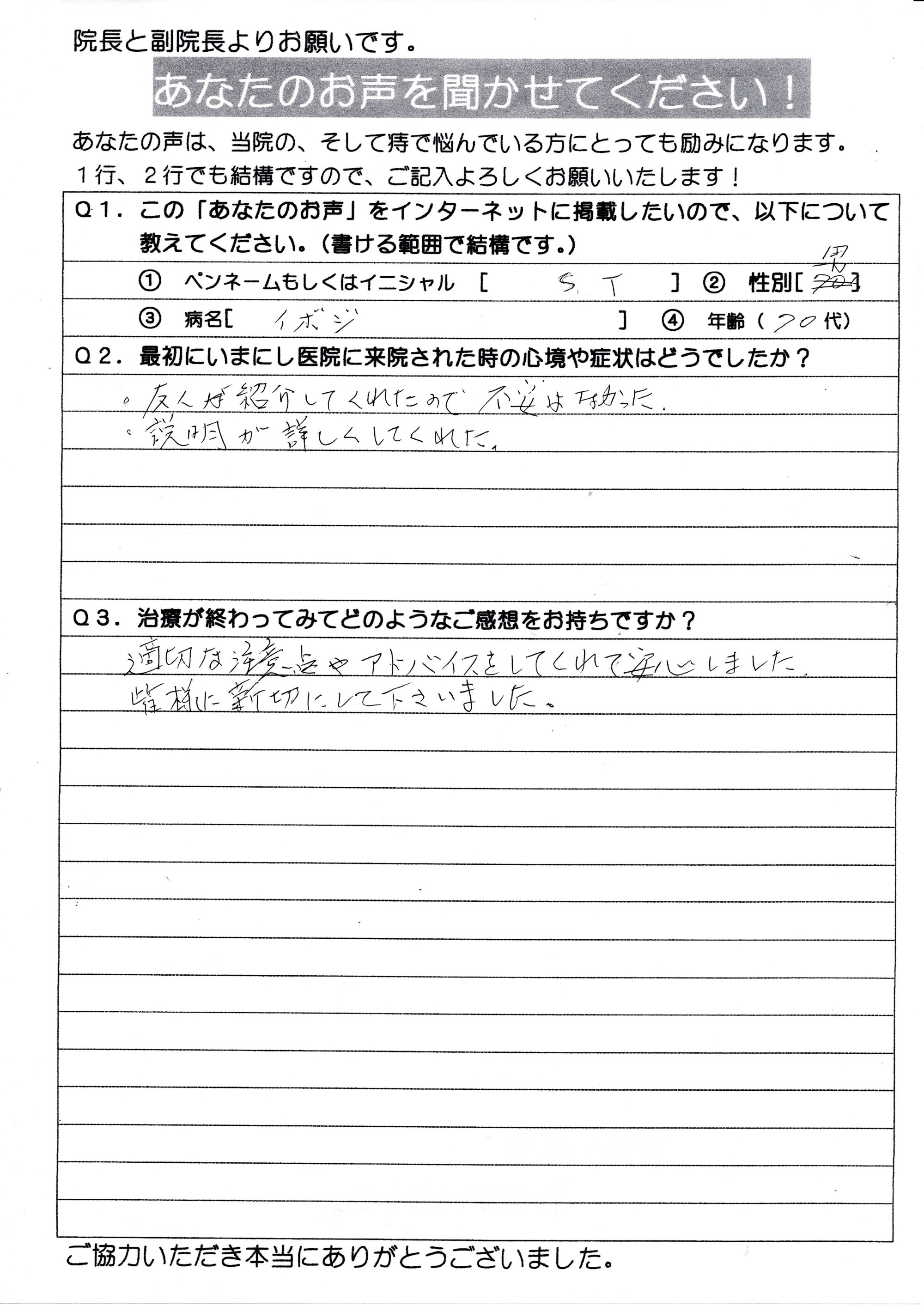 発症以来30年を経ていたため、今更と思いつつもいまにし医院の存在を知り逡巡を繰り返した挙句、その痛みに耐えられず訪院しました。痔疾の患者の多さに、待合室の混雑で知るところと成り、その事に依りむしろ他にも同じ悩みを持つ人の多さに安心感と先生への信頼感を持ちました。診療に入っても、その感情に変化は無く、全幅の信頼のもと完治にまで至りました。尚、私は16年を経て痔核の再発をみて、此度受診しました。先生よりジオン注治療の方法等の説明を受け、充分に了解納得のもと施術を受けました。