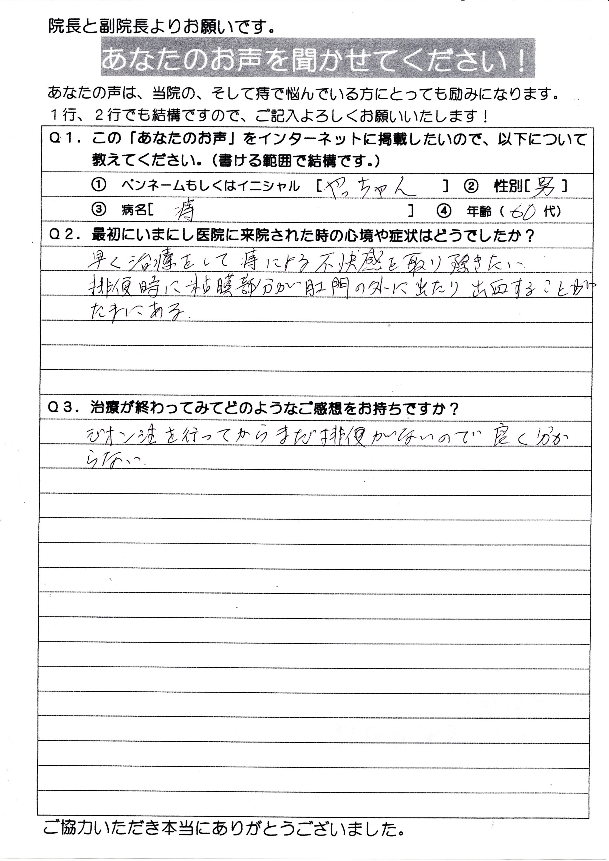 何度も結構な量の出血があり、その後排便時必ず出てくるようになり、何とかしたいと思い来ました。